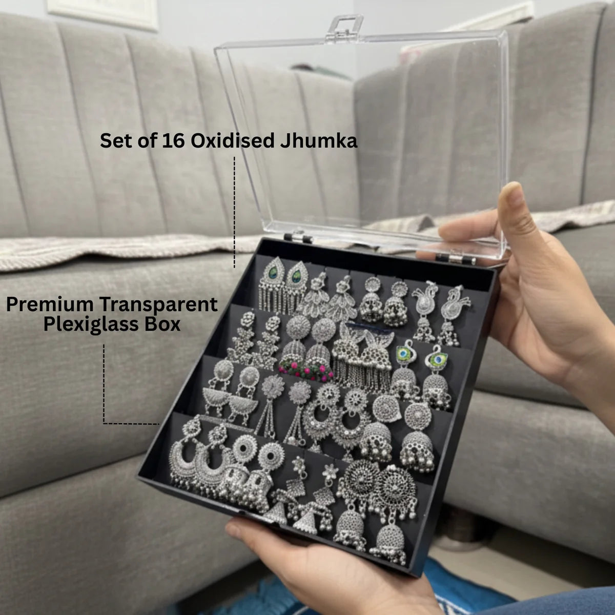 Upgrade your jewellery collection with this Set of 16 Oxidised Jhumkas, neatly arranged in a premium transparent plexiglass jewellery box.