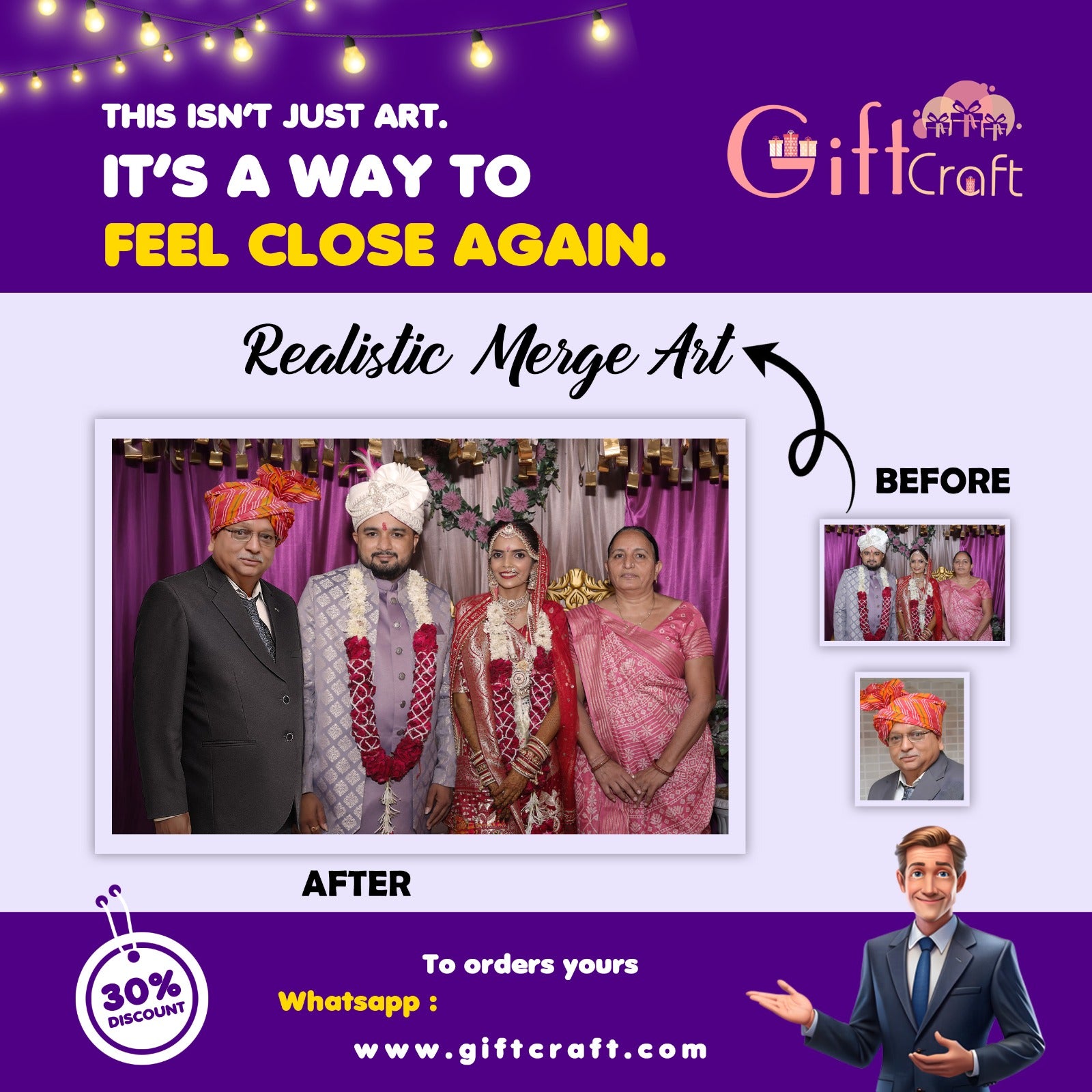 Life doesn’t always give us the chance to capture every moment with the people we love the most. With our Realistic Merge Art, we recreate that missing connection by bringing your loved ones together into a single, lifelike photograph.